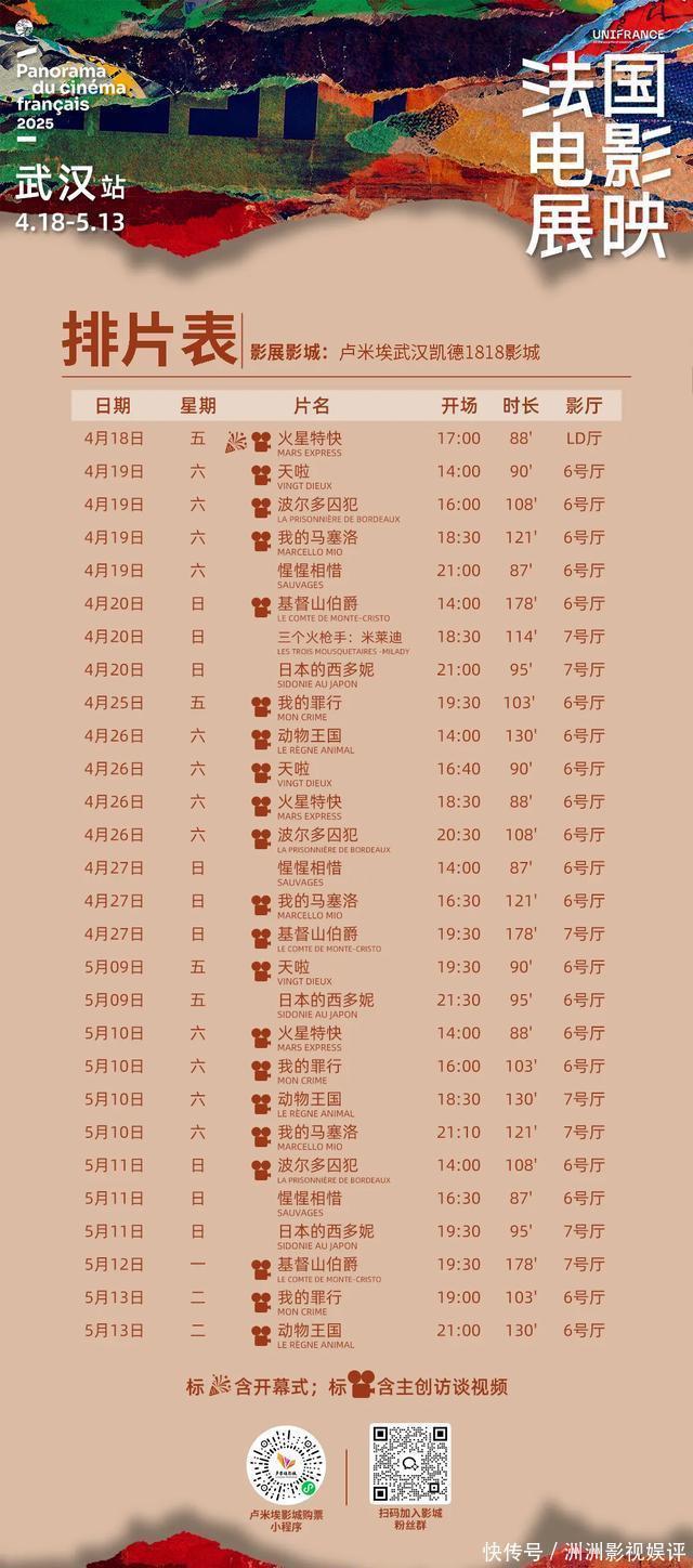 (记者:许诺通信员:刘婧娇)4月18日周五,2025年法国电影展映·武汉站在卢米埃武汉凯德1818影城负责拉开序幕!