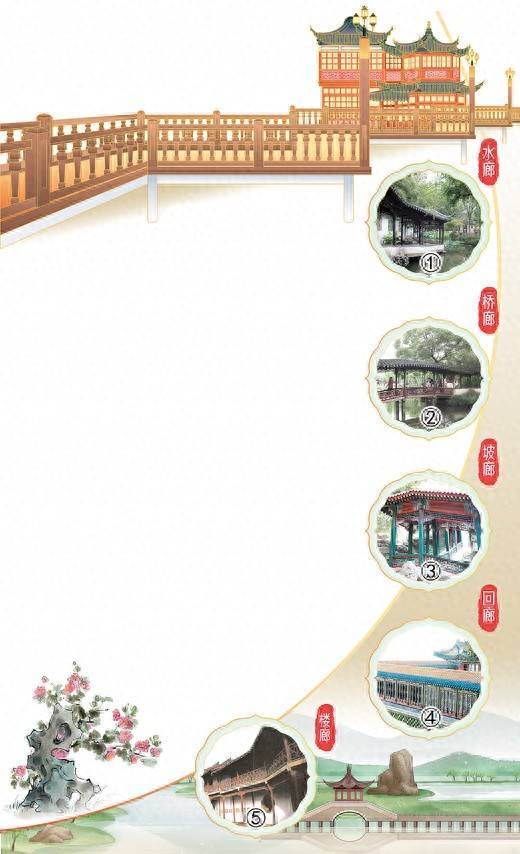 因与景物营造密切关联,廊在园林中布局解放、随形就势,有水陆、平坡、短长、单复之分。凭证位置与形态的不同,园林游廊可分为水廊、桥廊、坡廊、回廊、楼廊等。