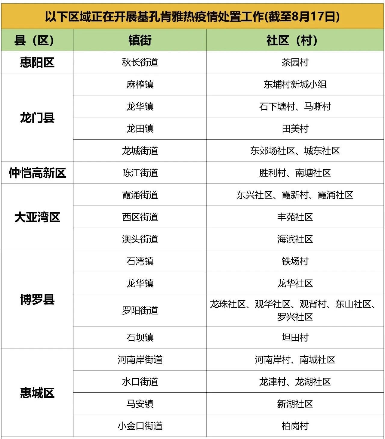 8月17日晚,惠州市疾控中心发布最新蚊媒传染病疫情教导。与此前公布的疫情科罚点比较(点击回看),本次公布的基孔肯雅热疫情科罚点中,大亚湾区西区街说念、澳头街说念以及惠城区小金口街说念,均存在新增科罚点。