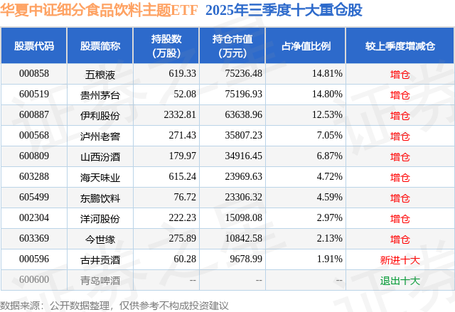 从基金畛域来看,中原中证细分食物饮料主题ETF基金2025年三季度公布的基金畛域为50.8亿元,较上一期畛域31.63亿元变化了19.17亿元,环比变化了60.59%。该基金最新一期金钱确立为:股票占净值比99.74%,无债券类金钱,现款占净值比0.54%。从基金捏仓来看,该基金当季前十大股票仓位达72.38%,第一大重仓股为五粮液(000858),捏仓占比为14.81%。