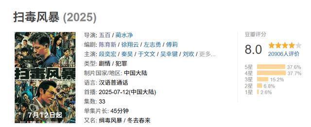 如今,跟着剧情快速推动,这部剧的收视和口碑也迎来一个小幅度高潮。 当今,《扫毒风暴》评分已出,豆瓣评分8.0,收视率2.2%,热度登顶,各项数据在同期均名列三甲,这个收视数据还曲直常亮眼的。