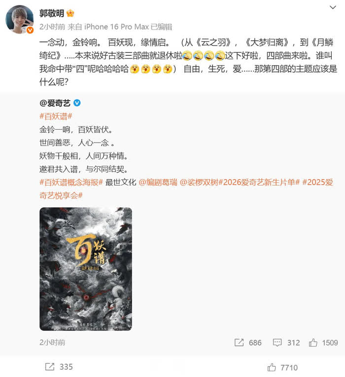 9月25日,2025 爱奇艺悦享会发布 2026 重生片单,东谈主气 IP《百妖谱》书记真东谈主影视化,办法海报同步亮相。随后,郭敬明转发关系本色。