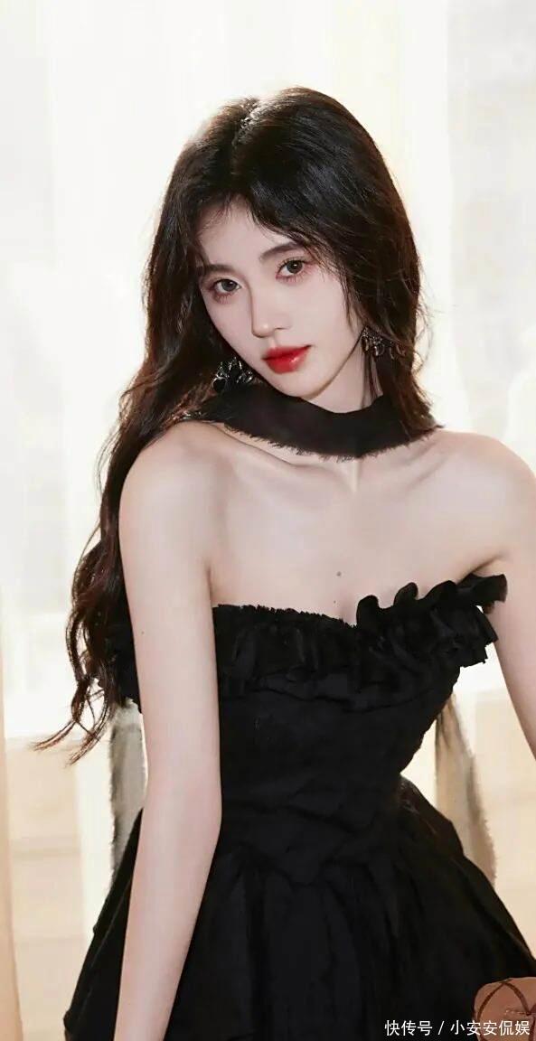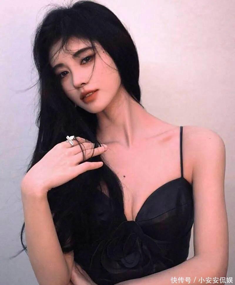 就像这张中,她穿戴玄色抹胸吊带裙,单手抚摸玄色长发,泄露傲东谈主的做事线,依旧性感火辣!
