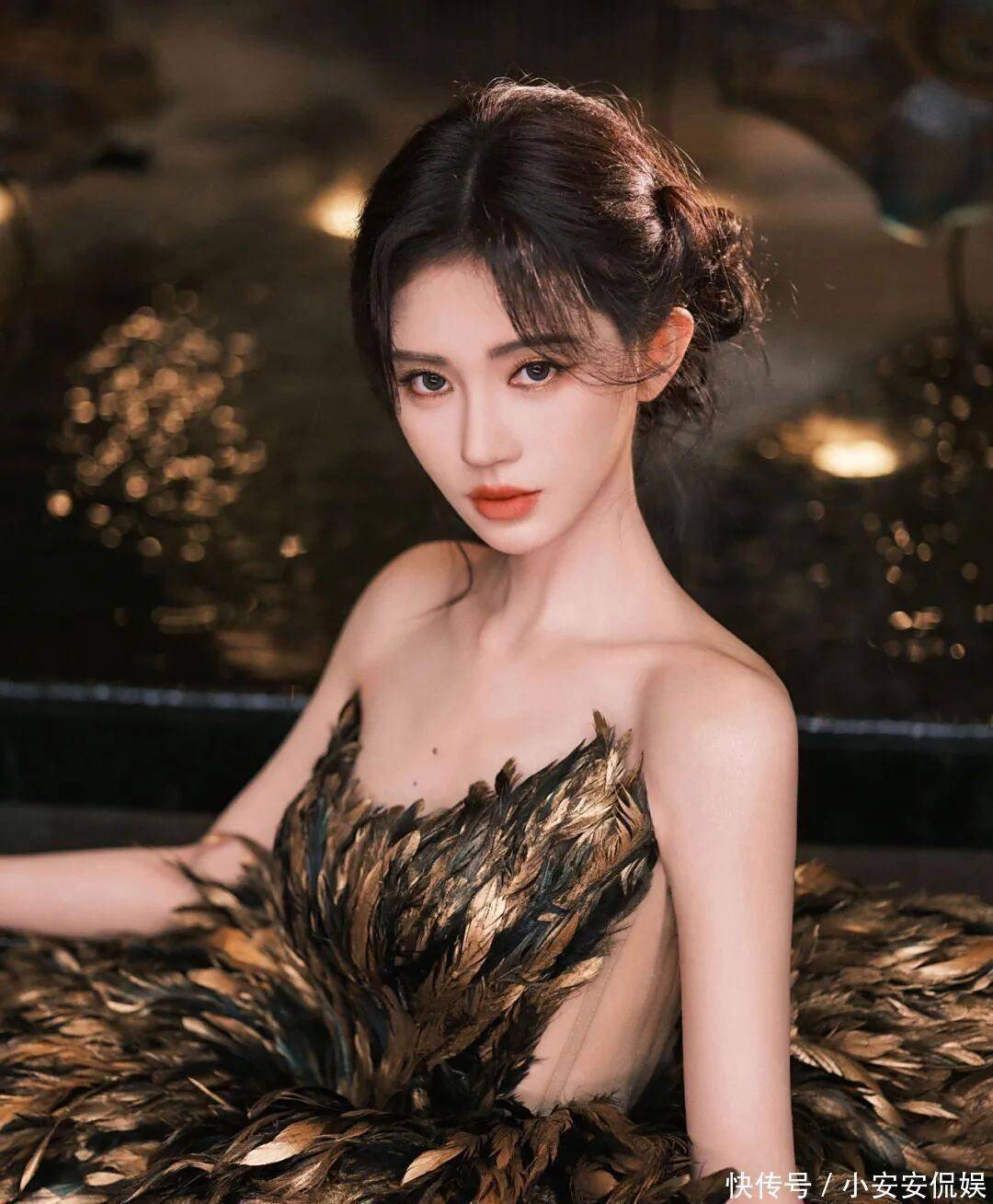 鞠婧祎穿戴金色羽毛抹胸衣裙,俏脸清丽脱俗,浓眉大眼,炎火红唇,长发盘起,她专诚泄露皎白的前胸和天鹅颈,肌肤皎白如雪,让性感魔力猛增!
