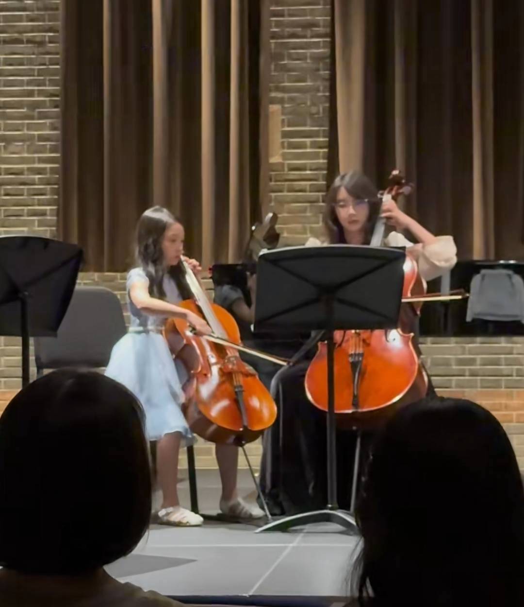 扮演现场,汪雨的两个女儿同台演奏。穿黑裙的大女儿约十五岁阁下,小女儿七八岁的神气,两东谈主气质肃穆,尽显精英讲授布景。