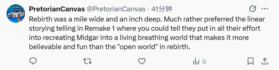沟通区有网友指出,《最终幻想7:腾达》诚然限制更大,但本色却显得“广而不深”。比较之下,更心爱《重制版1》的线性叙事,那种在米德加干涉系数心血、将城市重塑为一个充满人命力与真正感的天下的作念法,让游戏的千里浸感与乐趣远胜《腾达》的所谓“通达天下”。