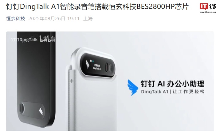 据恒玄科技当天音问,钉钉 DingTalk A1 智能灌音笔搭载恒玄科技 6nm 制程工艺的 BES2800HP 芯片。