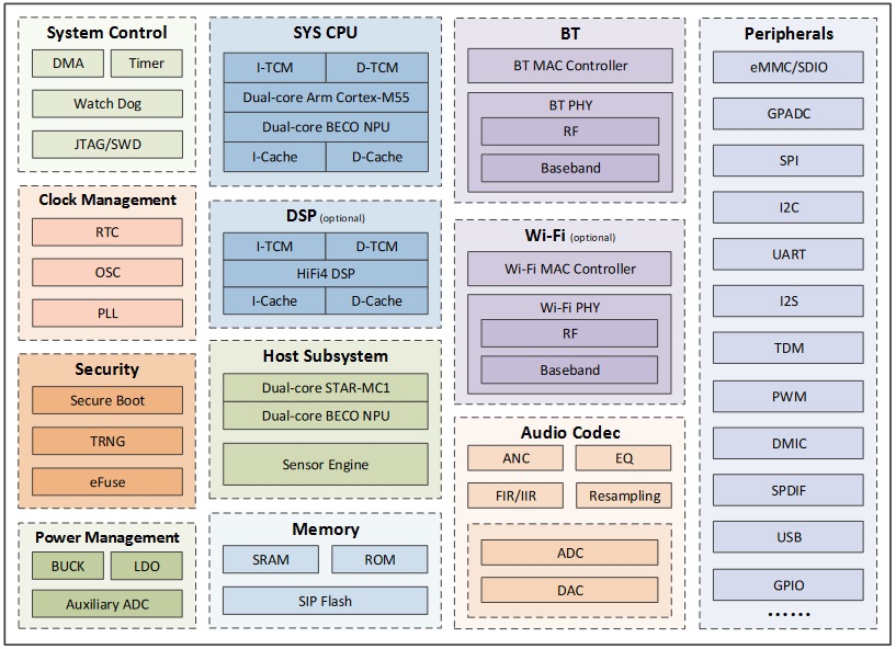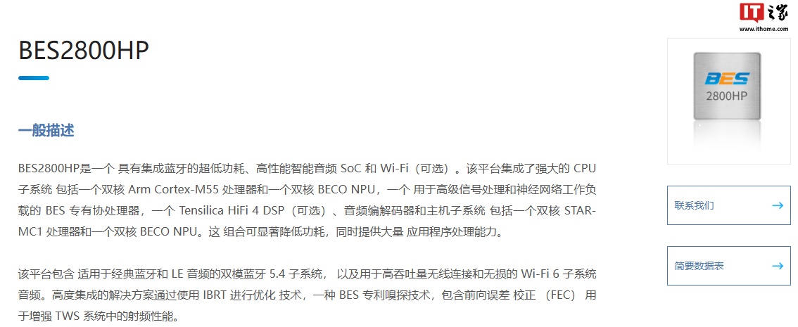 IT之家查询恒玄科技官网获悉,BES2800HP 是一个具有集成蓝牙的超低功耗、高性能智能音频 SoC 和 Wi-Fi(可选)。该平台集成了 CPU 子系统包括一个双核 Arm Cortex-M55 处理器和一个双核 BECO NPU,一个用于高等信号处理和神经网罗职责负载的 BES 私有协处理器,一个 Tensilica HiFi 4 DSP(可选)、音频编解码器和主机子系统包括一个双核 STAR-MC1 处理器和一个双核 BECO NPU。