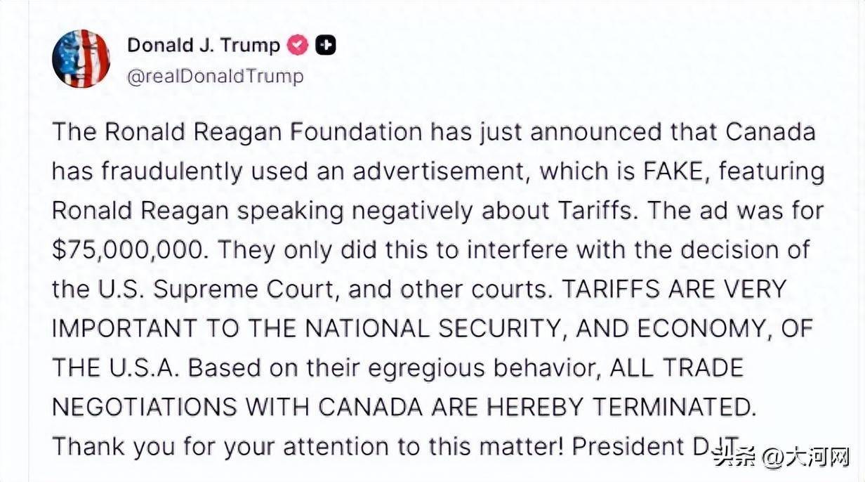 特朗普在帖文中附上了罗纳德·里根基金会发布的声明,声明称,加拿大安梗概省政府发布了一则告白,其中使用了前总统里根1987年4月25日发表的“对于目田公说念买卖的寰球播送语言”的部分音频和视频片断。该告白诬陷了前总统里根的播送语言本色,且安梗概省政府在使用和裁剪这些语言本色时既未寻求也未得到许可。