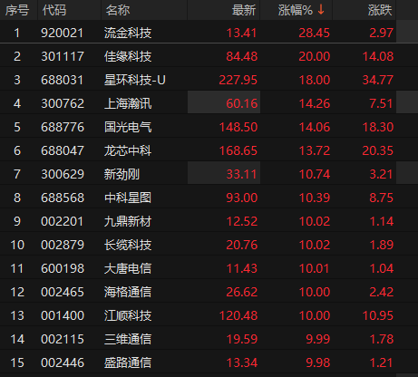上证报中国证券网讯 1月14日早盘,贸易航天看法股颠簸反弹,戒指10时40分,佳缘科技20cm涨停,九编削材、长缆科技、大唐电信、江顺科技、盛路通讯等多股封板,星环科技、上海瀚讯、国光电气等涨超10%。