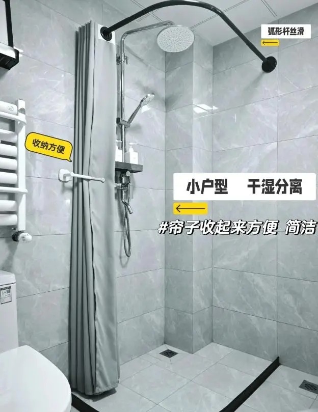 尤其是小户型的卫生间,诚意提出你用不占地的浴帘,四肢干湿永别打算哦。